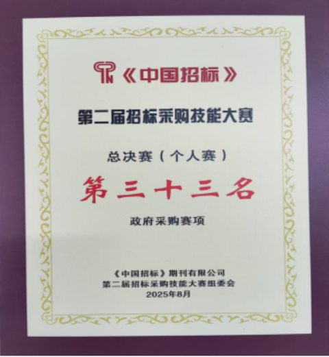 8月23日,由《中国招标》期刊有限公司主办的第二届招标采购技能大赛总决赛圆满落幕。我办钟小文同志在大赛中脱颖而出,斩获政府采购赛项-个人赛总决赛第33名。
