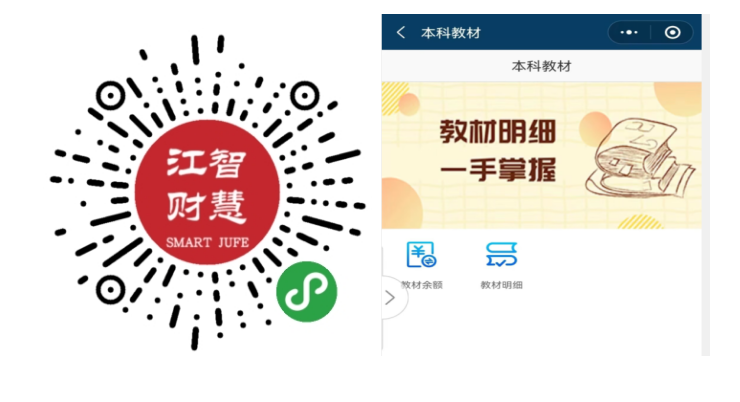 手机扫描二维码关注“智慧江财微信小程序”, 点击“本科教材”查询教材余额和教材使用明细。