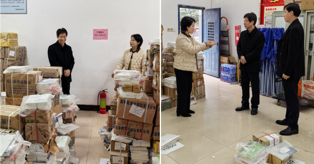 为确保新学期教学用书及时到位、书库安全万无一失,2月28日下午,招标采购办公室主任白耀辉、副主任刘秀民带领图书教材服务科全体人员,先后来到各校区教材书库,实地查看教材到位情况、整理进度,并开展消防安全专项检查。白耀辉强调,教材保障是开学准备工作的重中之重。他指出,书库作为重点防火部位,必须时刻保持高度警惕,坚决杜绝各类安全隐患。检查过程中,科室成员还逐一排查了书库消防设施、用电安全及禁火标识设置情况,严格落实“严禁烟火”等安全管理制度,进一步筑牢书库安全防线。
